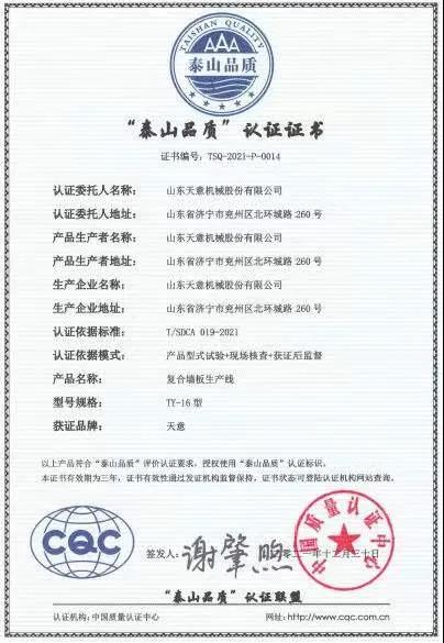 下一步天意機械將根據(jù)行業(yè)發(fā)展導向,堅持改革創(chuàng)新,持續(xù)提升企業(yè)智能制造水平,引導企業(yè)向著品牌高端化扎實邁進。天意機械多次獲得國家級榮譽、省級知名品牌、優(yōu)質(zhì)品牌、省高端品牌培育企業(yè)等榮譽,此次天意機械獲得“泰山品質(zhì)”產(chǎn)品認證證書,將更有利于企業(yè)品牌價值的提升和高品質(zhì)形象的塑造,有利于提升企業(yè)的市場競爭力。