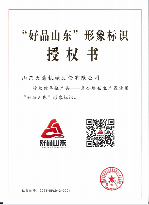 9月12日,由山東省市場監(jiān)管局會同省委宣傳部、省發(fā)展改革委、淄博市政府共同主辦的山東省2023年“質(zhì)量月”啟動儀式在淄博舉行?;顒影l(fā)布第二批“好品山東”品牌遴選名單,共計105個品牌,天意機械憑借復合墻板生產(chǎn)線入選“好品山東”品牌遴選名單。