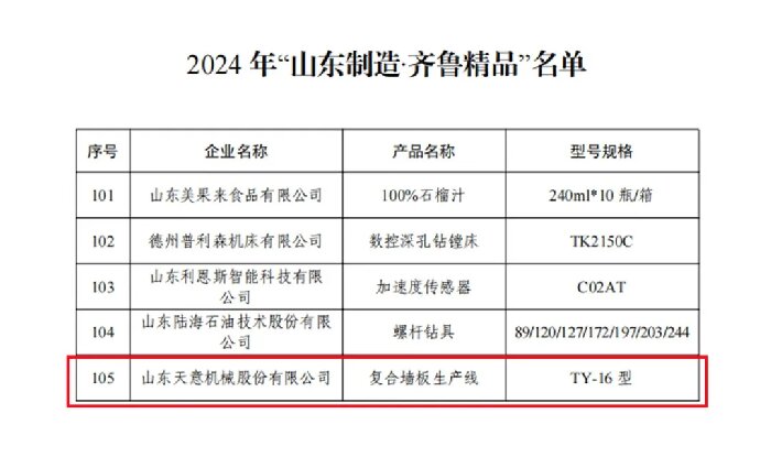 近日,山東省工信廳公布了2024年“山東制造·齊魯精品”名單,天意機(jī)械裝配式建筑智能裝備榜上有名!