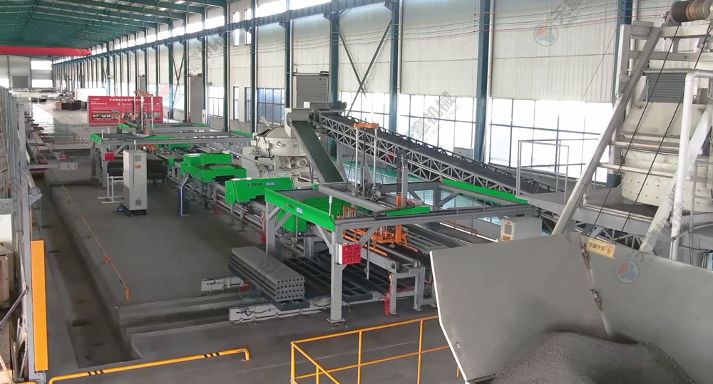 擠壓墻板生產(chǎn)線結(jié)構(gòu)緊湊,自動化程度高,設(shè)備主機固定,墻板成型時物料受擠壓和振動同時作用,連續(xù)自動擠壓振搗成型,保證墻板具有良好的密實性和外形尺寸,成型后進行初凝養(yǎng)護。板坯移動方便,場地使用靈活、利用效率高。成型工段推料擠壓螺旋變頻調(diào)速,由中央控制器調(diào)整控制灰渣板成型的密實程度,實現(xiàn)灰渣板的連續(xù)自動流水線生產(chǎn)。由于采用低水灰比的干硬性混合料擠壓成型,可得到強度和密實度較高的空心墻板。自動化連續(xù)生產(chǎn),效率高,質(zhì)量一致性高,保障了墻板品質(zhì)。廣泛用于框架結(jié)構(gòu)和鋼結(jié)構(gòu)建筑物。