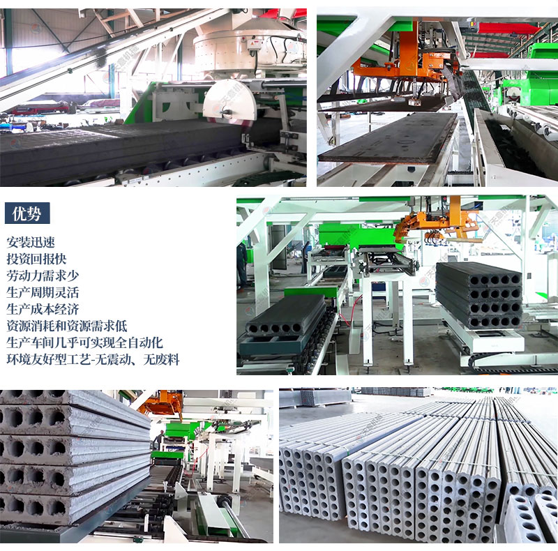 該機利用各種建筑垃圾的固體廢棄物、工業(yè)爐渣,粉煤灰,植物秸稈,頁巖等材料生產(chǎn)的輕質(zhì)隔墻板是環(huán)保、節(jié)能、利廢的新型建材,符合建筑模數(shù),能實現(xiàn)生產(chǎn)的標(biāo)準(zhǔn)化、系列化、通用化、建筑施工干作業(yè),比各種砌塊和磚的墻體至少可以提高施工效率3倍以上。